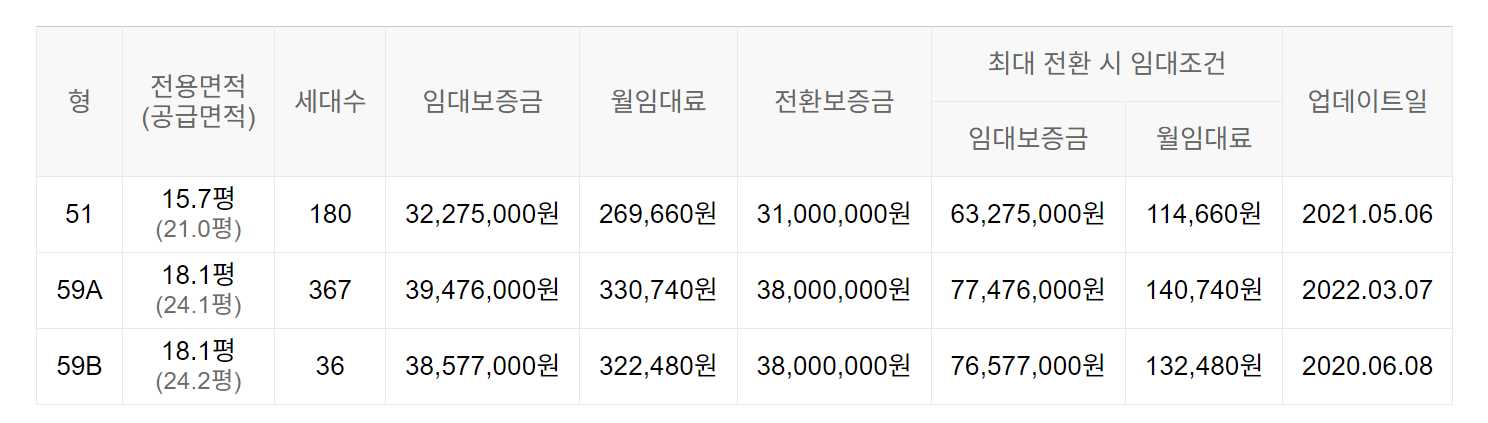 임대보증금 및 월 임대료는 입주자 모집공고일 기준이며, 보증금 최대 전환 시 변동될 수 있습니다.