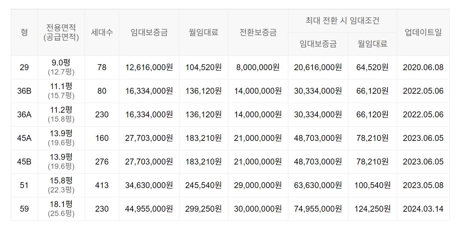 임대보증금 및 월 임대료는 입주자 모집공고일 기준이며, 보증금 최대 전환 시 변동될 수 있습니다.
