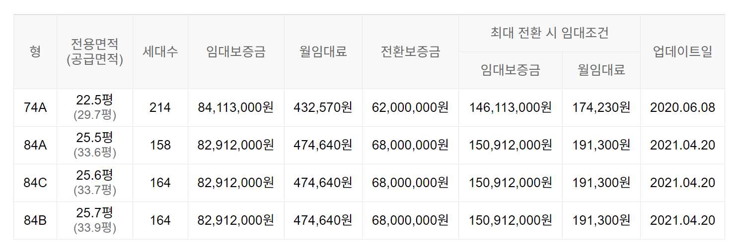 임대보증금 및 월 임대료는 입주자 모집공고일 기준이며, 보증금 최대 전환 시 변동될 수 있습니다.