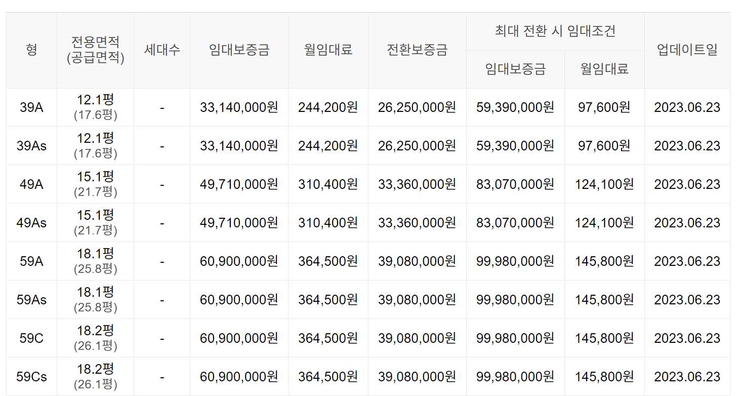 임대보증금 및 월 임대료는 입주자 모집공고일 기준이며, 보증금 최대 전환 시 변동될 수 있습니다.