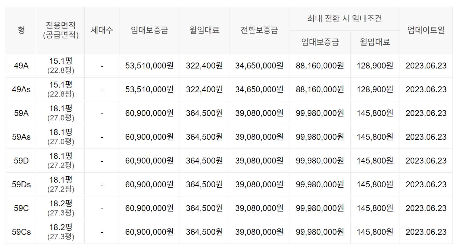 임대보증금 및 월 임대료는 입주자 모집공고일 기준이며, 보증금 최대 전환 시 변동될 수 있습니다.