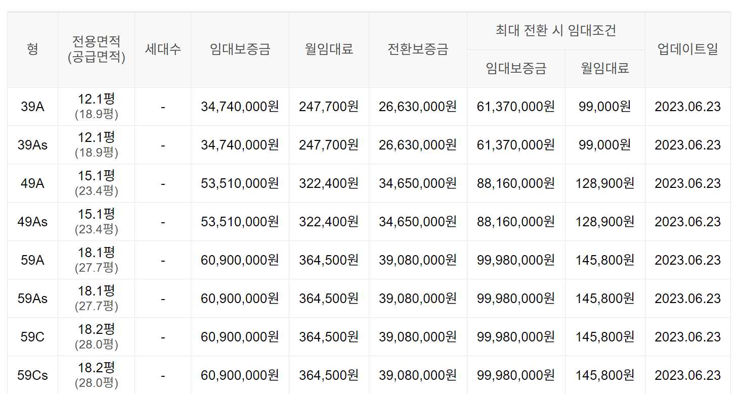 임대보증금 및 월 임대료는 입주자 모집공고일 기준이며, 보증금 최대 전환 시 변동될 수 있습니다.