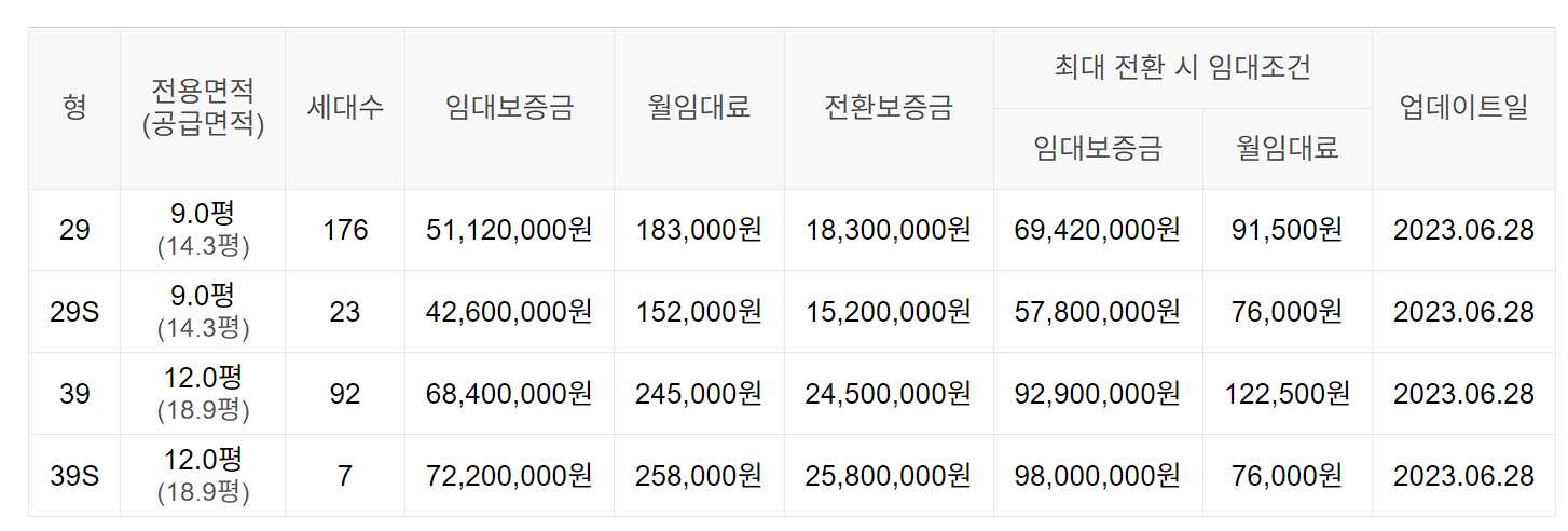 임대보증금 및 월 임대료는 입주자 모집공고일 기준이며, 보증금 최대 전환 시 변동될 수 있습니다.