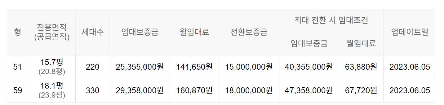 임대보증금 및 월 임대료는 입주자 모집공고일 기준이며, 보증금 최대 전환 시 변동될 수 있습니다.