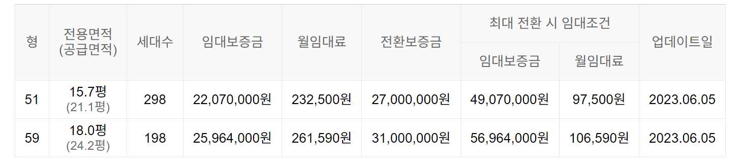 임대보증금 및 월 임대료는 입주자 모집공고일 기준이며, 보증금 최대 전환 시 변동될 수 있습니다.