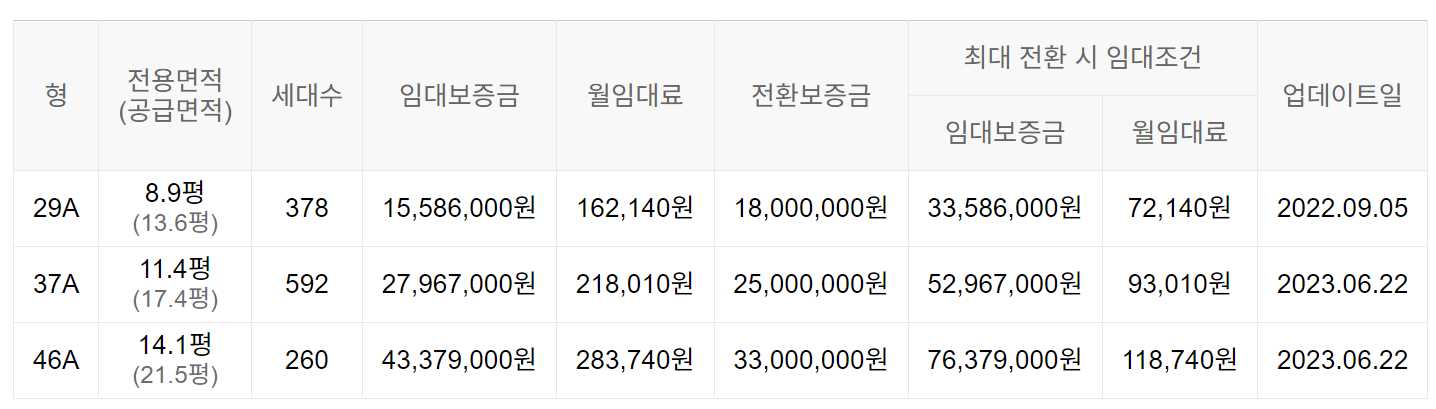 임대보증금 및 월 임대료는 입주자 모집공고일 기준이며, 보증금 최대 전환 시 변동될 수 있습니다.