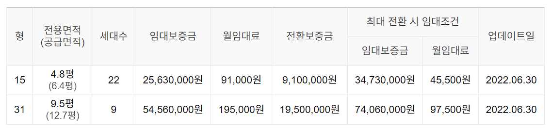 임대보증금 및 월 임대료는 입주자 모집공고일 기준이며, 보증금 최대 전환 시 변동될 수 있습니다.