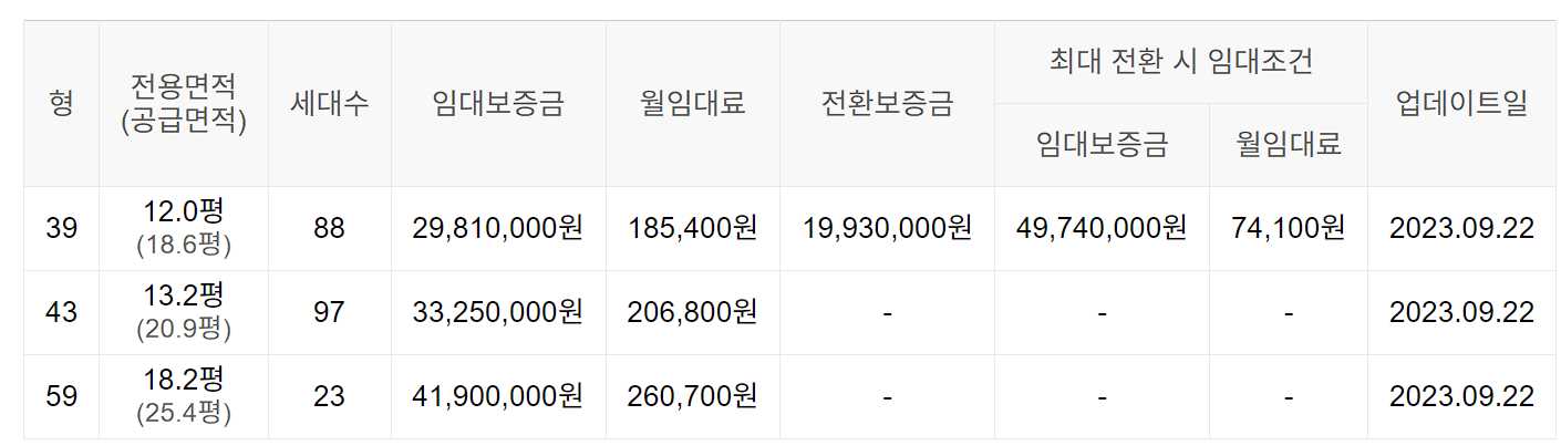 임대보증금 및 월 임대료는 입주자 모집공고일 기준이며, 보증금 최대 전환 시 변동될 수 있습니다.