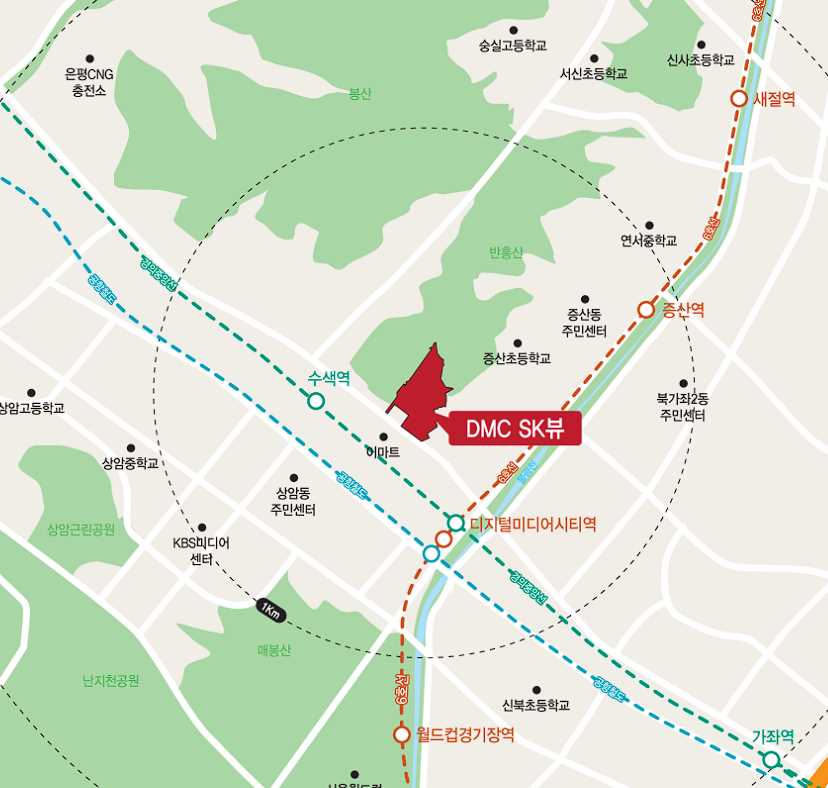 DMC SK뷰는 서울 은평구 디지털미디어시티역, 수색역 근처에 위치하고 있습니다.