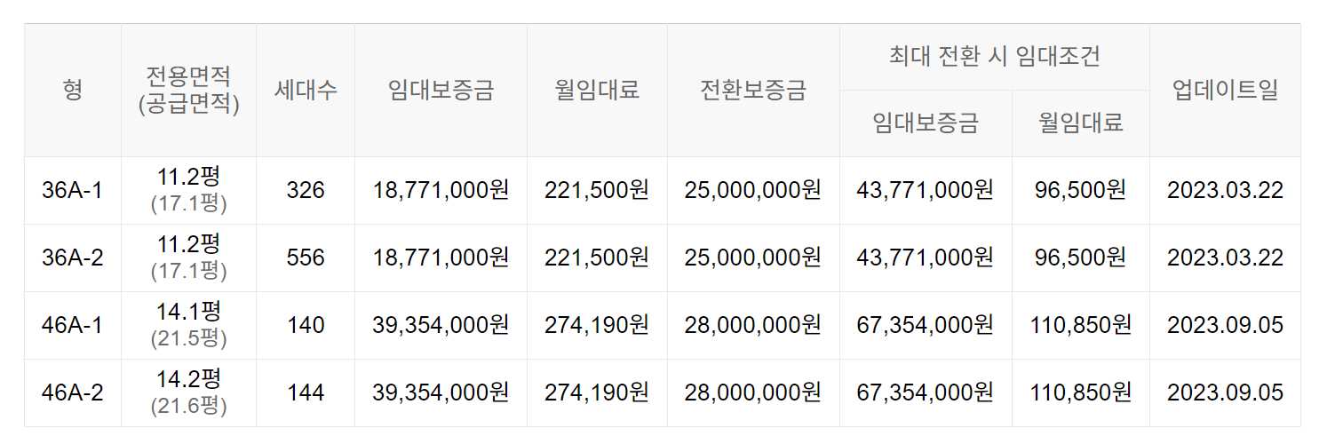 임대보증금 및 월 임대료는 입주자 모집공고일 기준이며, 보증금 최대 전환 시 변동될 수 있습니다.