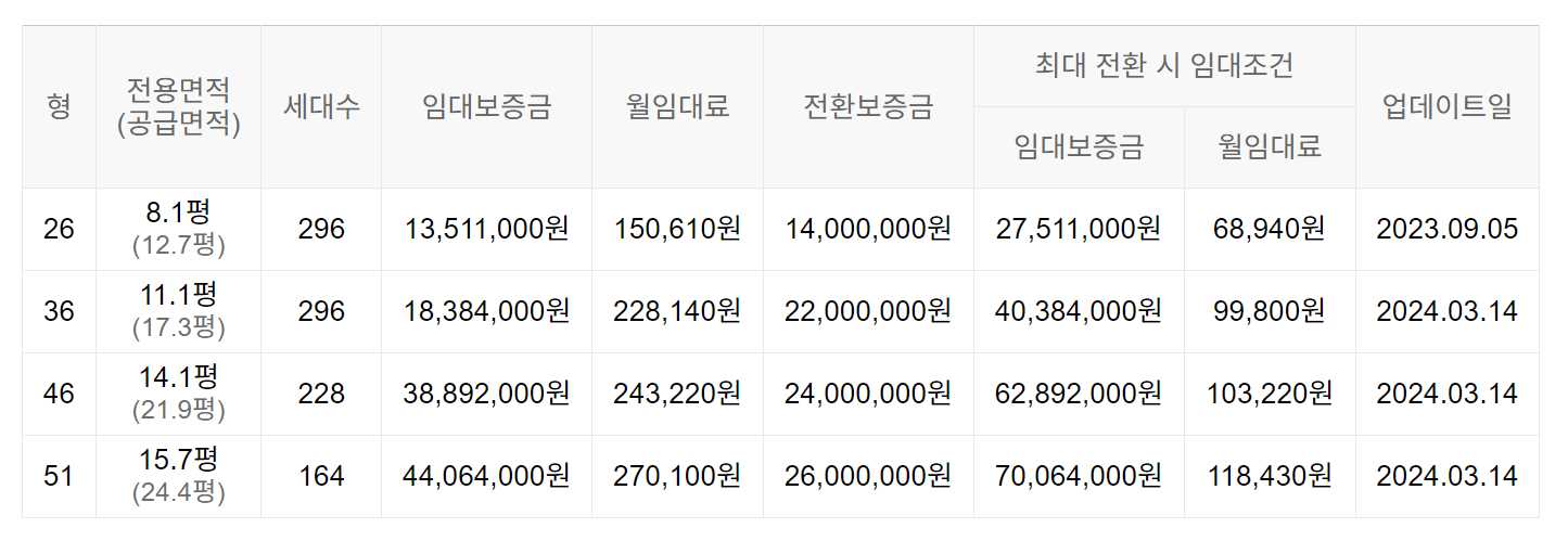 임대보증금 및 월 임대료는 입주자 모집공고일 기준이며, 보증금 최대 전환 시 변동될 수 있습니다.