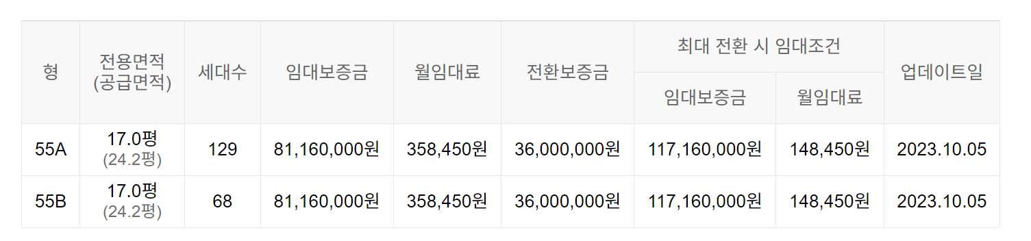 임대보증금 및 월 임대료는 입주자 모집공고일 기준이며, 보증금 최대 전환 시 변동될 수 있습니다.