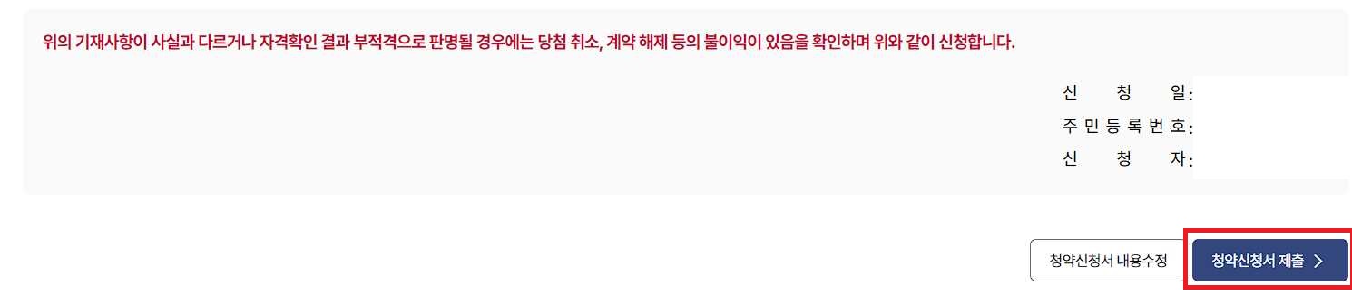 청약 신청 정보를 모두 다 확인 후에 정상 입력했다면, 청약신청서 제출을 눌러서 청약신청을 완료하면 됩니다.
