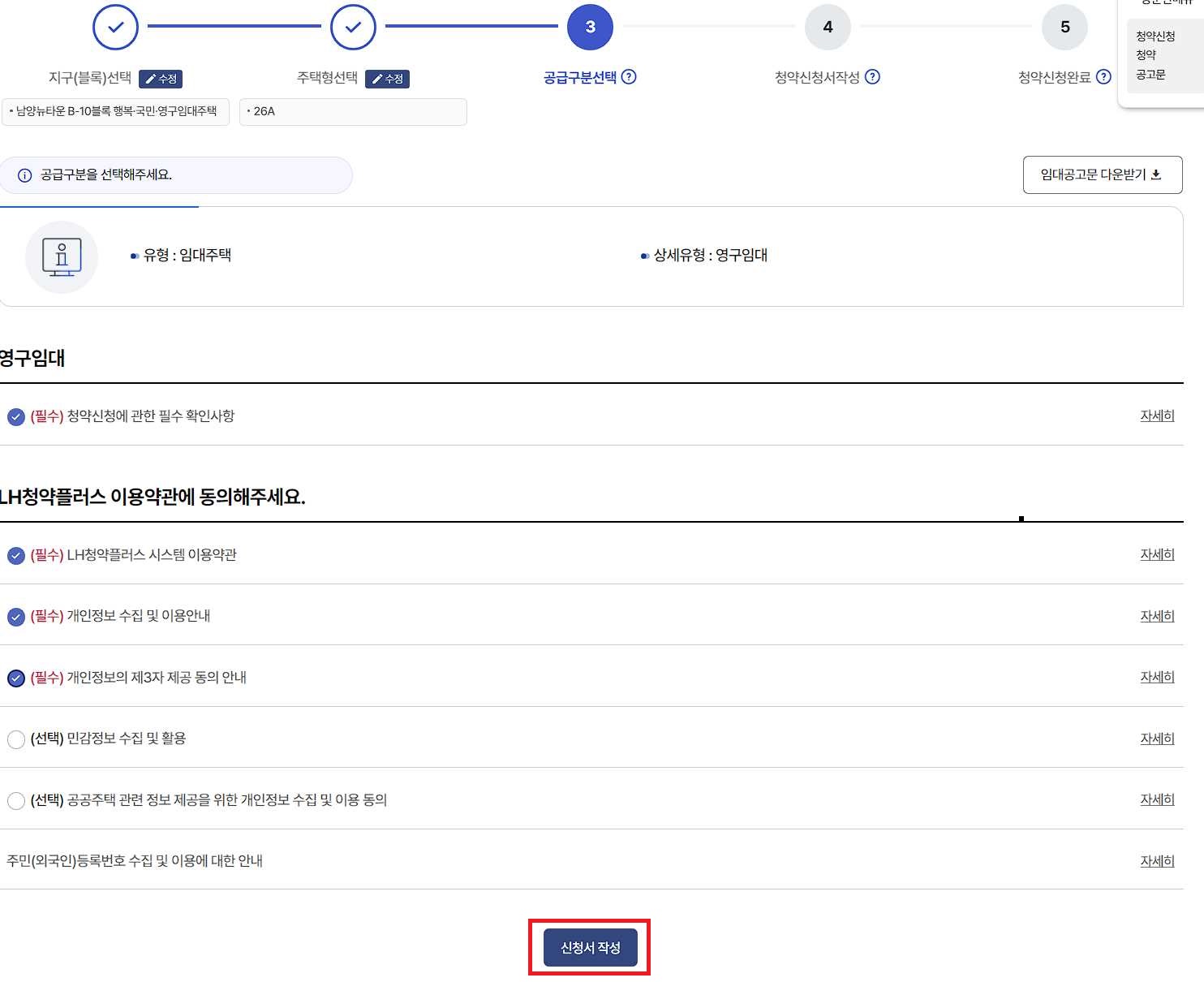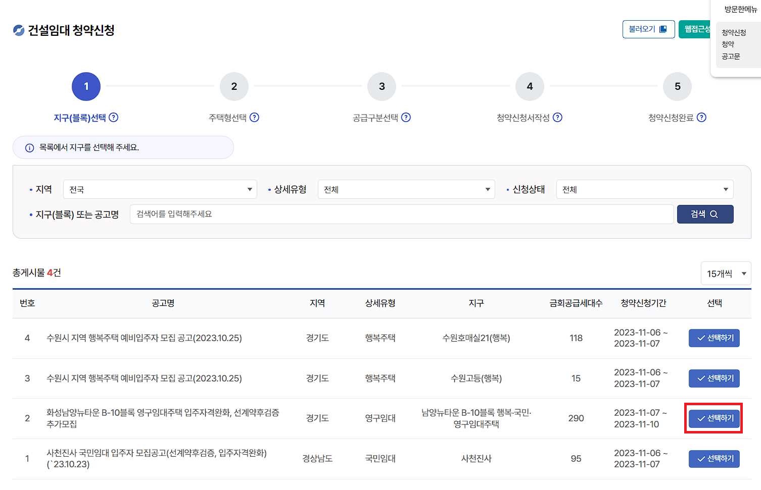 4. 청약 신청 공고 선택