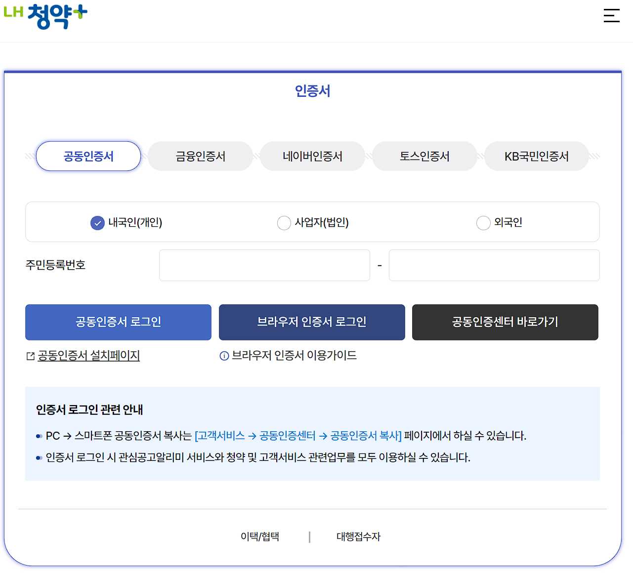 공동인증서, 금융인증서, 네이버인증서, 토스인증서, KB국민인증서 등을 통해서 로그인을 해야 청약 신청이 가능합니다.