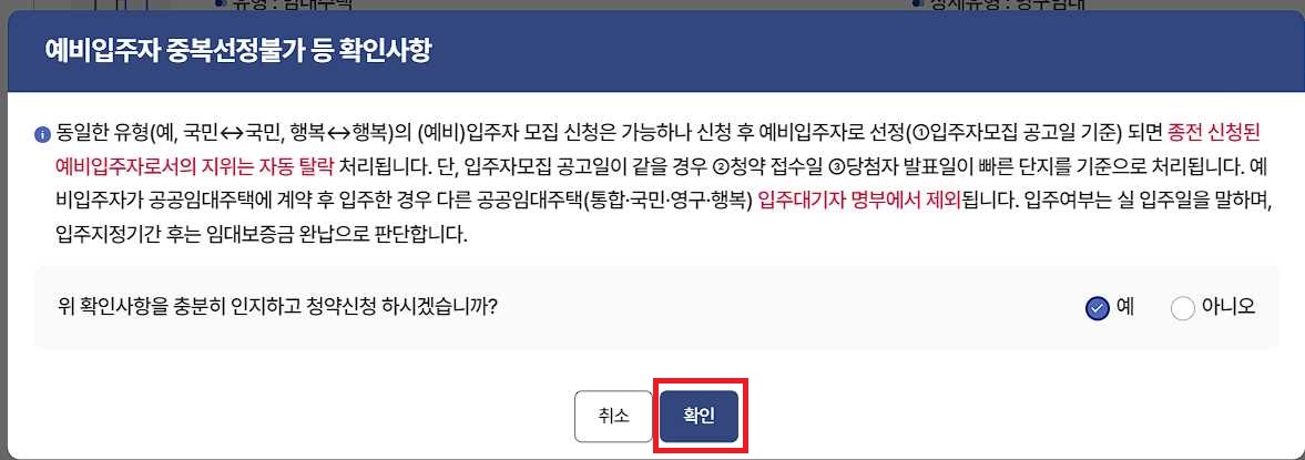 예비입주자 중복선정불가 등 확인사항은 예를 선택 후 확인을 눌러줍니다.
