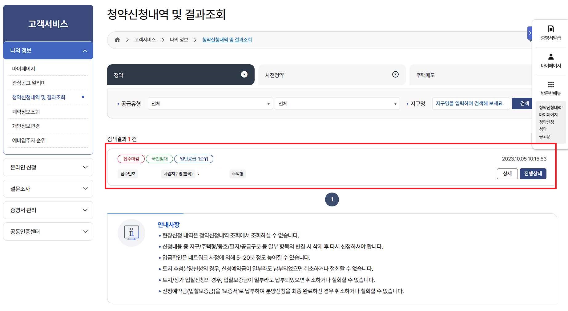 고객서비스-나의정보-청약신청내역 및 결과조회에서 내가 신청한 청약 정보를 확인이 가능합니다.