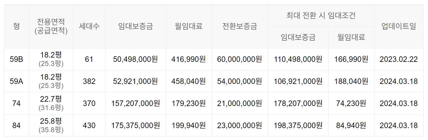 임대보증금 및 월 임대료는 입주자 모집공고일 기준이며, 보증금 최대 전환 시 변동될 수 있습니다.