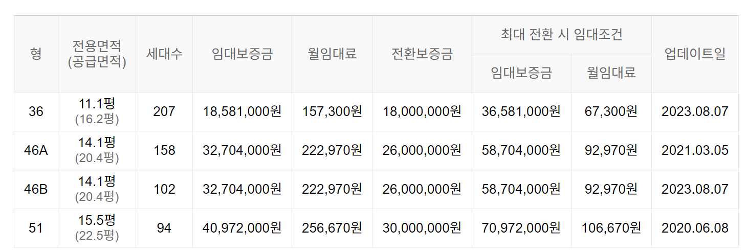 임대보증금 및 월 임대료는 입주자 모집공고일 기준이며, 보증금 최대 전환 시 변동될 수 있습니다.