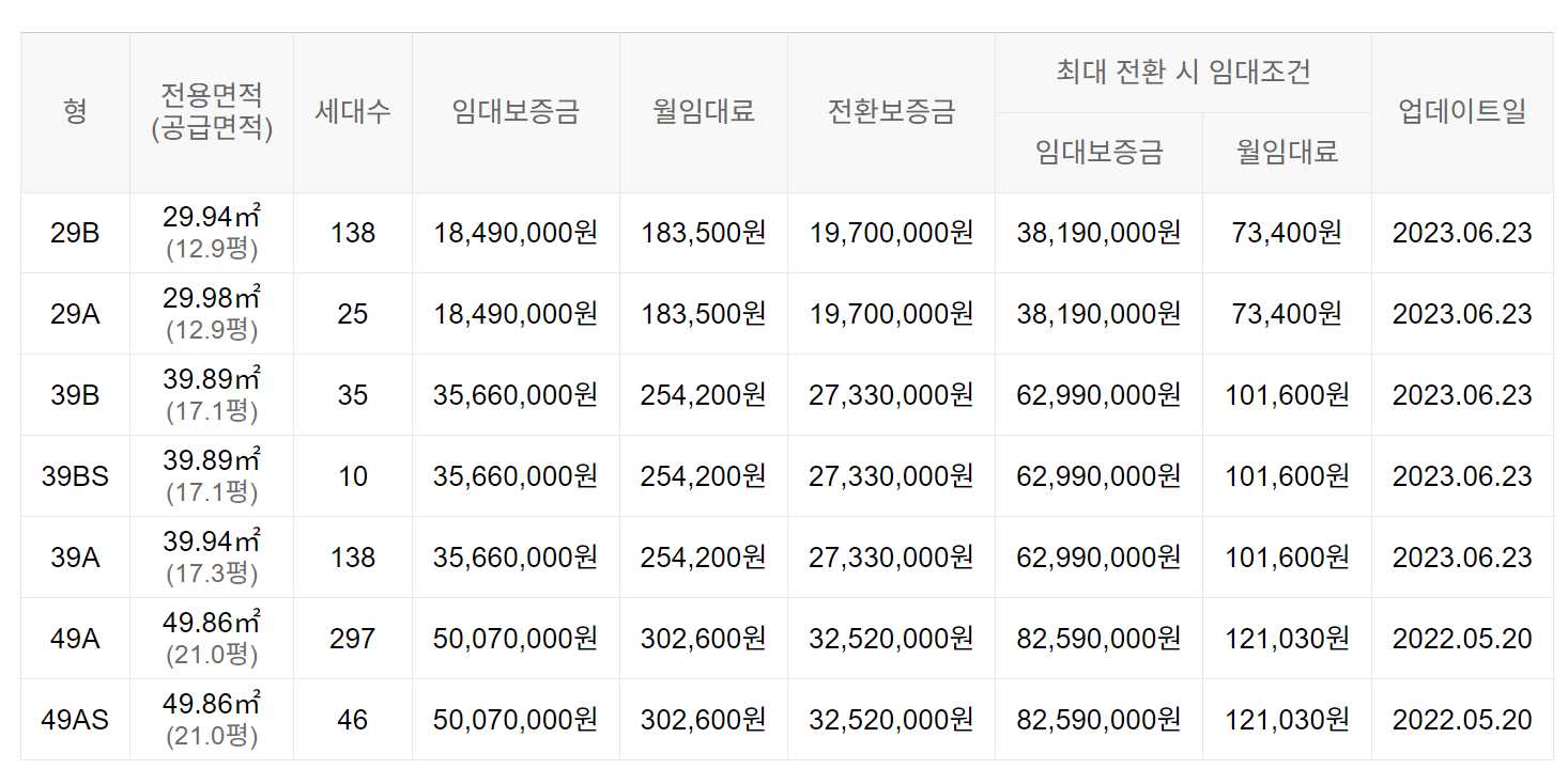 임대보증금 및 월 임대료는 입주자 모집공고일 기준이며, 보증금 최대 전환 시 변동될 수 있습니다.