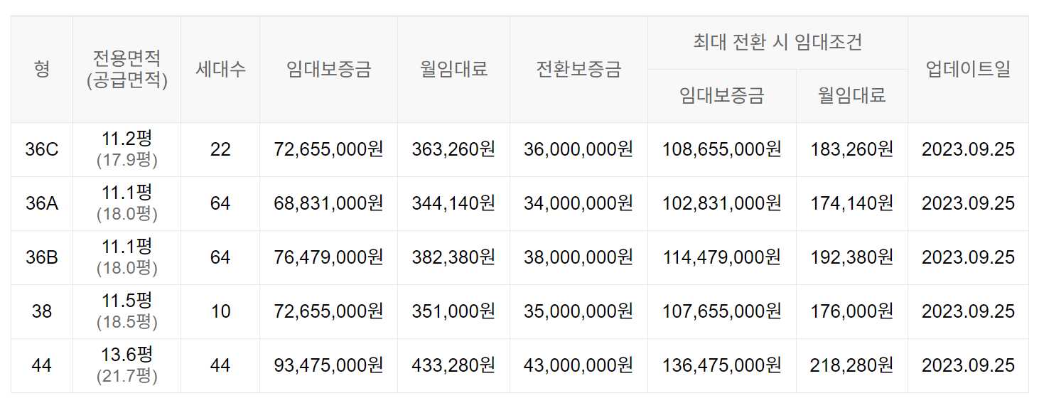 임대보증금 및 월 임대료는 입주자 모집공고일 기준이며, 보증금 최대 전환 시 변동될 수 있습니다.