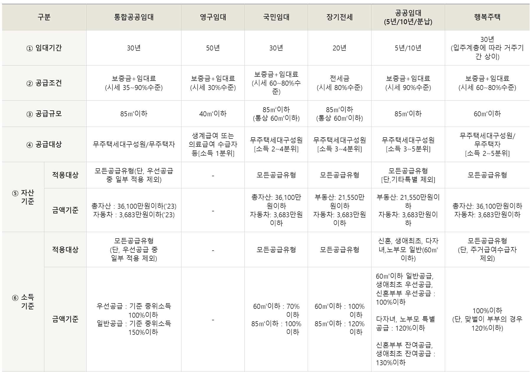 - 금액기준 60 ㎡이하 : 기준 중위소득 70%이하, 85 ㎡이하 : 기준 중위소득 120%이하