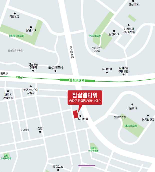 잠실엘타워는 서울 송파구 잠실새내역, 삼전역, 종합운동장 근처에 위치하고 있습니다.