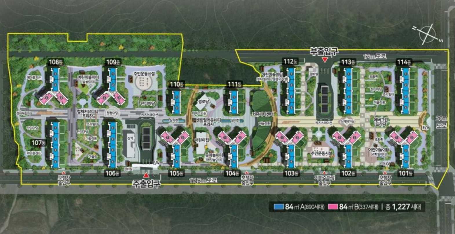 지하 + 지상 주차장 (총 1,738대, 세대당 1.41대), 무인택배함, 어린이놀이터, 공동육아나눔터, 외부 공용공간