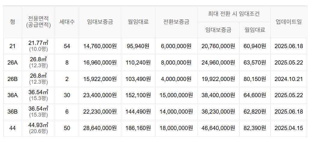 임대보증금 및 월 임대료는 입주자 모집공고일 기준이며, 보증금 최대 전환 시 변동될 수 있습니다.