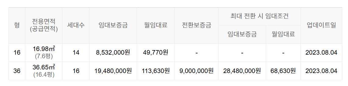 임대보증금 및 월 임대료는 입주자 모집공고일 기준이며, 보증금 최대 전환 시 변동될 수 있습니다.