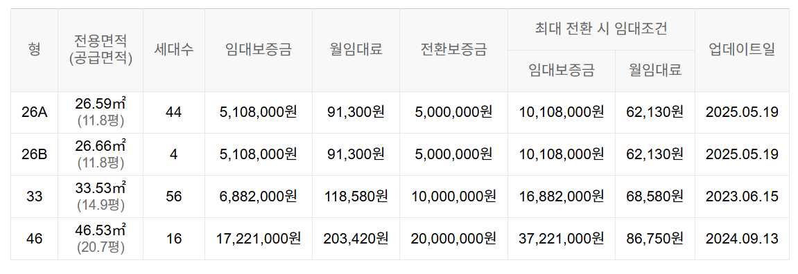 임대보증금 및 월 임대료는 입주자 모집공고일 기준이며, 보증금 최대 전환 시 변동될 수 있습니다.