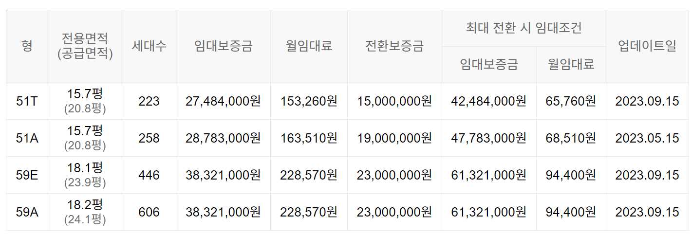 임대보증금 및 월 임대료는 입주자 모집공고일 기준이며, 보증금 최대 전환 시 변동될 수 있습니다.