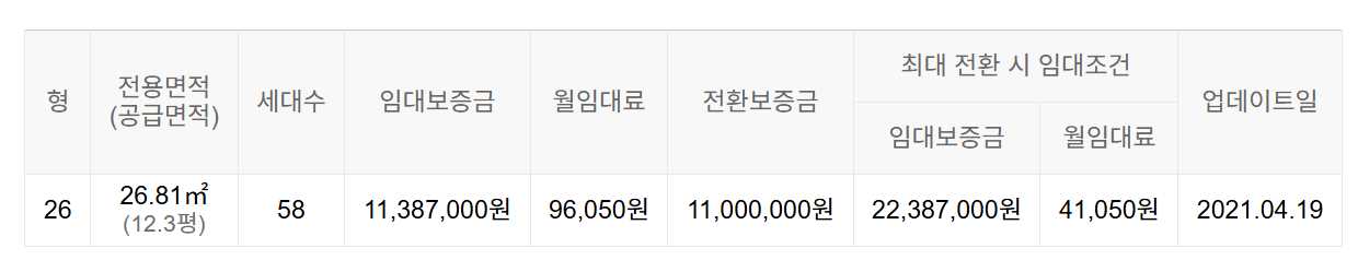 임대보증금 및 월 임대료는 입주자 모집공고일 기준이며, 보증금 최대 전환 시 변동될 수 있습니다.