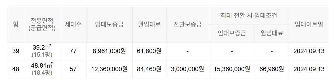 임대보증금 및 월 임대료는 입주자 모집공고일 기준이며, 보증금 최대 전환 시 변동될 수 있습니다.