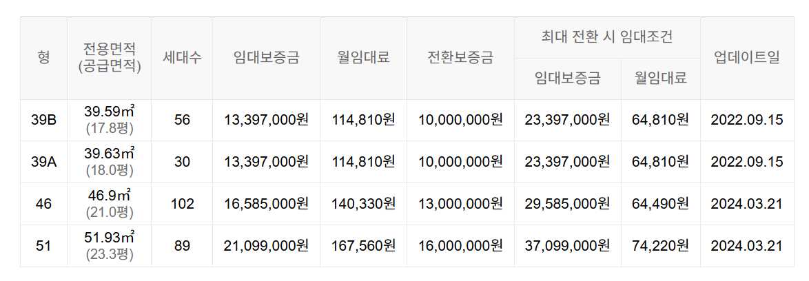 임대보증금 및 월 임대료는 입주자 모집공고일 기준이며, 보증금 최대 전환 시 변동될 수 있습니다.