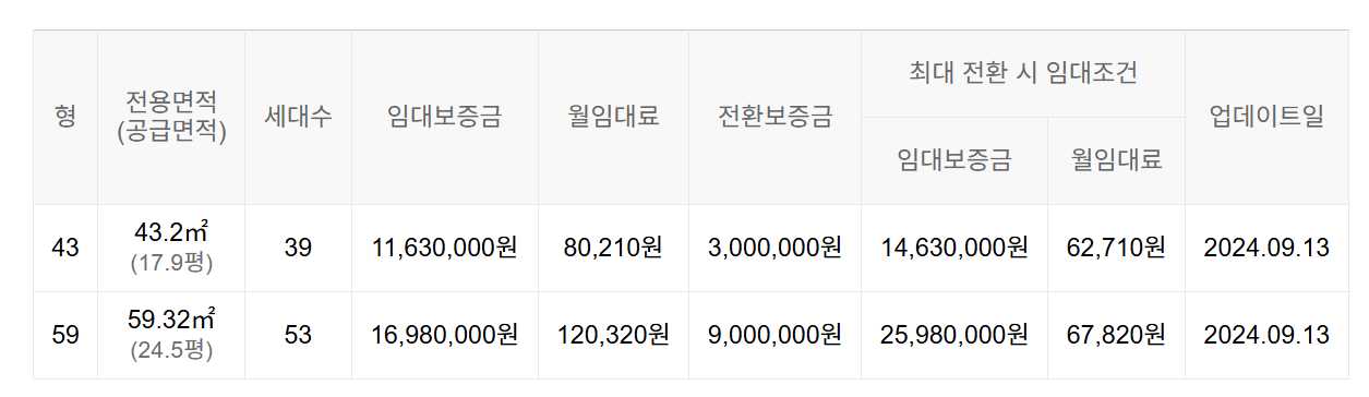 임대보증금 및 월 임대료는 입주자 모집공고일 기준이며, 보증금 최대 전환 시 변동될 수 있습니다.