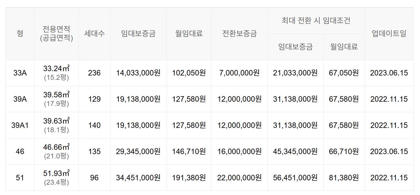 임대보증금 및 월 임대료는 입주자 모집공고일 기준이며, 보증금 최대 전환 시 변동될 수 있습니다.