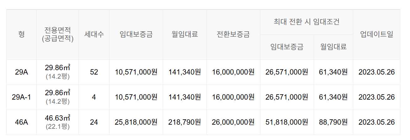 임대보증금 및 월 임대료는 입주자 모집공고일 기준이며, 보증금 최대 전환 시 변동될 수 있습니다.