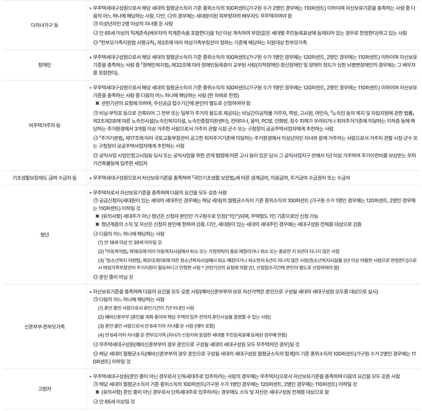 - 우선공급 : 월평균소득이 기준 중위소득 100% 이하