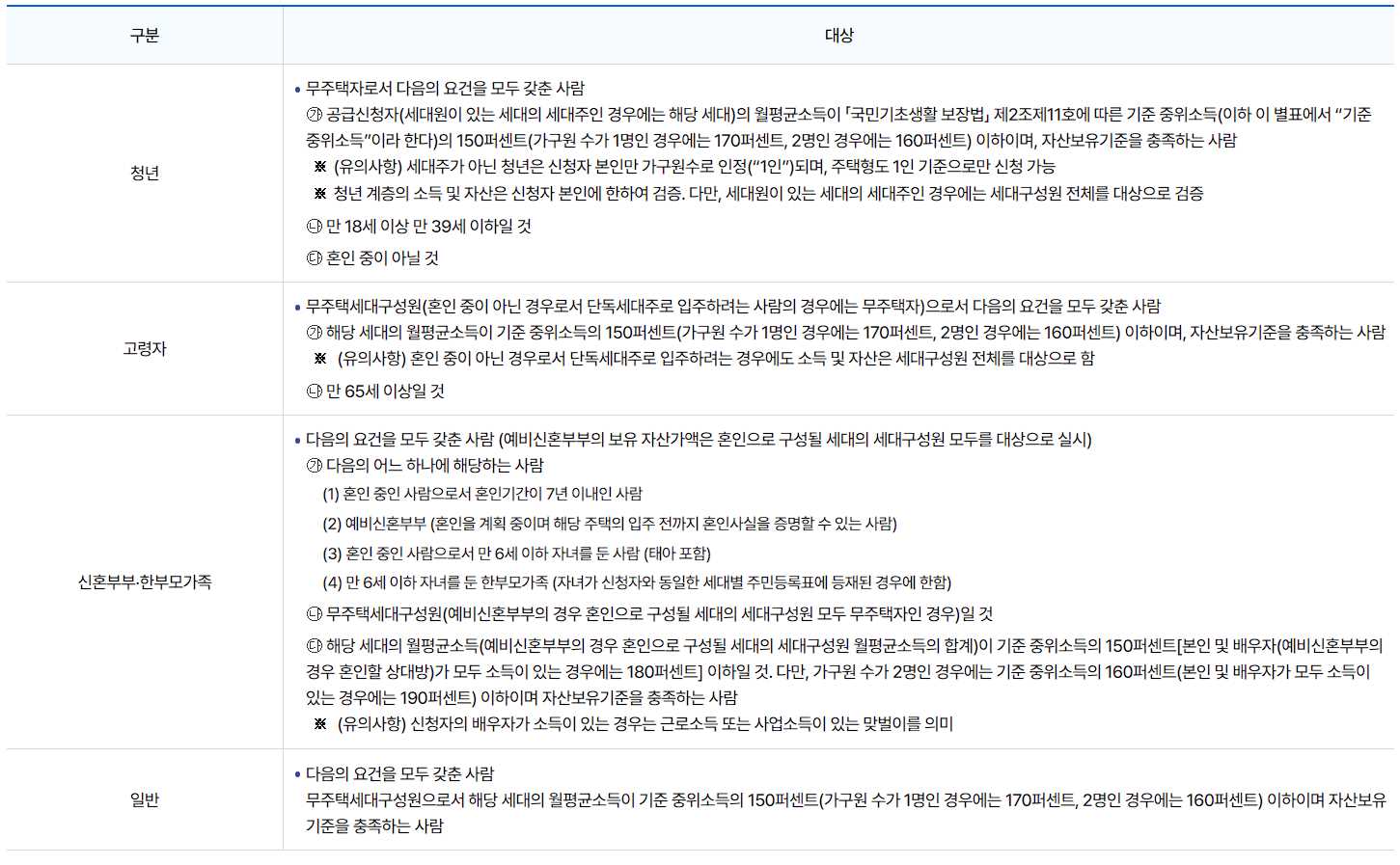 - 일반공급 : 월평균소득이 기준 중위소득 150% 이하