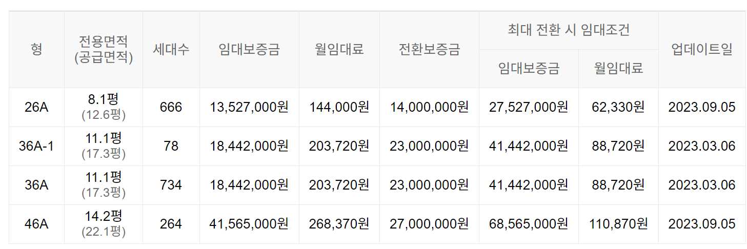 임대보증금 및 월 임대료는 입주자 모집공고일 기준이며, 보증금 최대 전환 시 변동될 수 있습니다.